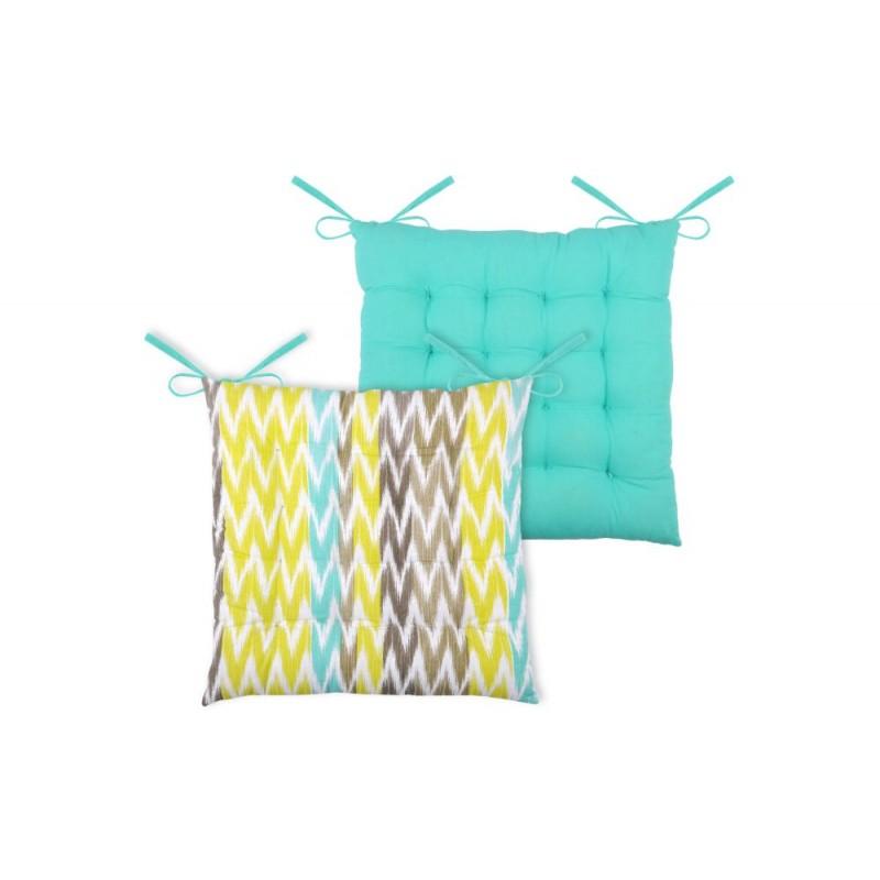 Perna turcoaz scaun Ikati Bleu (Anis) Rayee cu compoziție 100% bumbac are dimensiunea 40x40 cm și este un produs marca Stof - Franța. Designul acestei perne pentru scaun este unul modern - cu zig-zaguri  în care predomină culoarile turcoaz, galben-verde dar și culorile alb și grej. Această pernă de scaun are două fețe - una cu model multicolor sub formă de zig-zag iar pe verso este o față uni turcoaz. Perna pentru scaun Ikati Bleu (Anis) Rayee este un produs plin de culoare și compoziția acestui produs este naturală - 100% bumbac. Produsul pernă pentru scaun este foarte potrivit pentru o locuință tinerescă și poate fi folosit la scaunele din bucătorie sau cele de pe terasa din grădină. Calitate superioară a materialelor din care acest produs este fabricat il fac ușor de întreținut și de curățat.